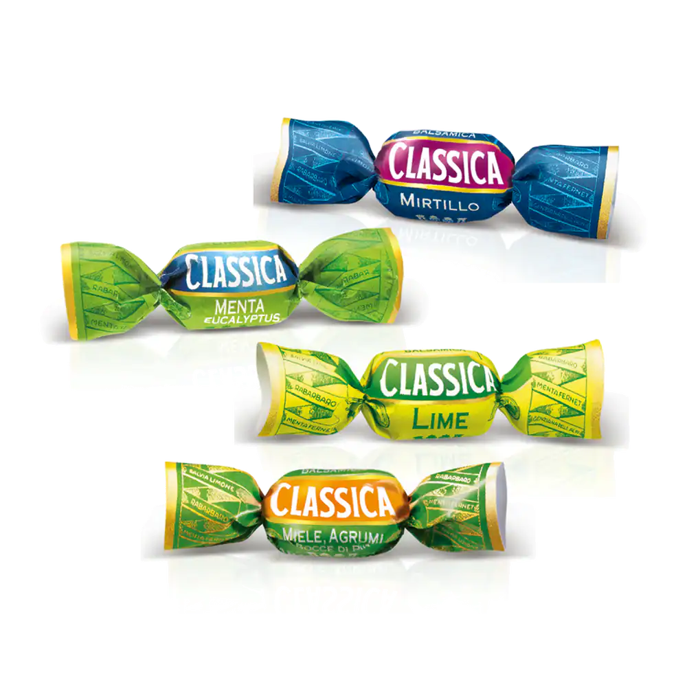 Nella confezione, un misto di 4 gusti di Caramelle Classiche Baratti al gusto Balsamico: Mirtillo, Lime, Menta Eucalyptus e Miele, Agrumi e Gocce di Pino.