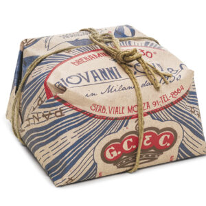 Panettone con canditi d’albicocca e cioccolato di Modica ricoperto di glassa e granella di nocciole, incarto a mano.