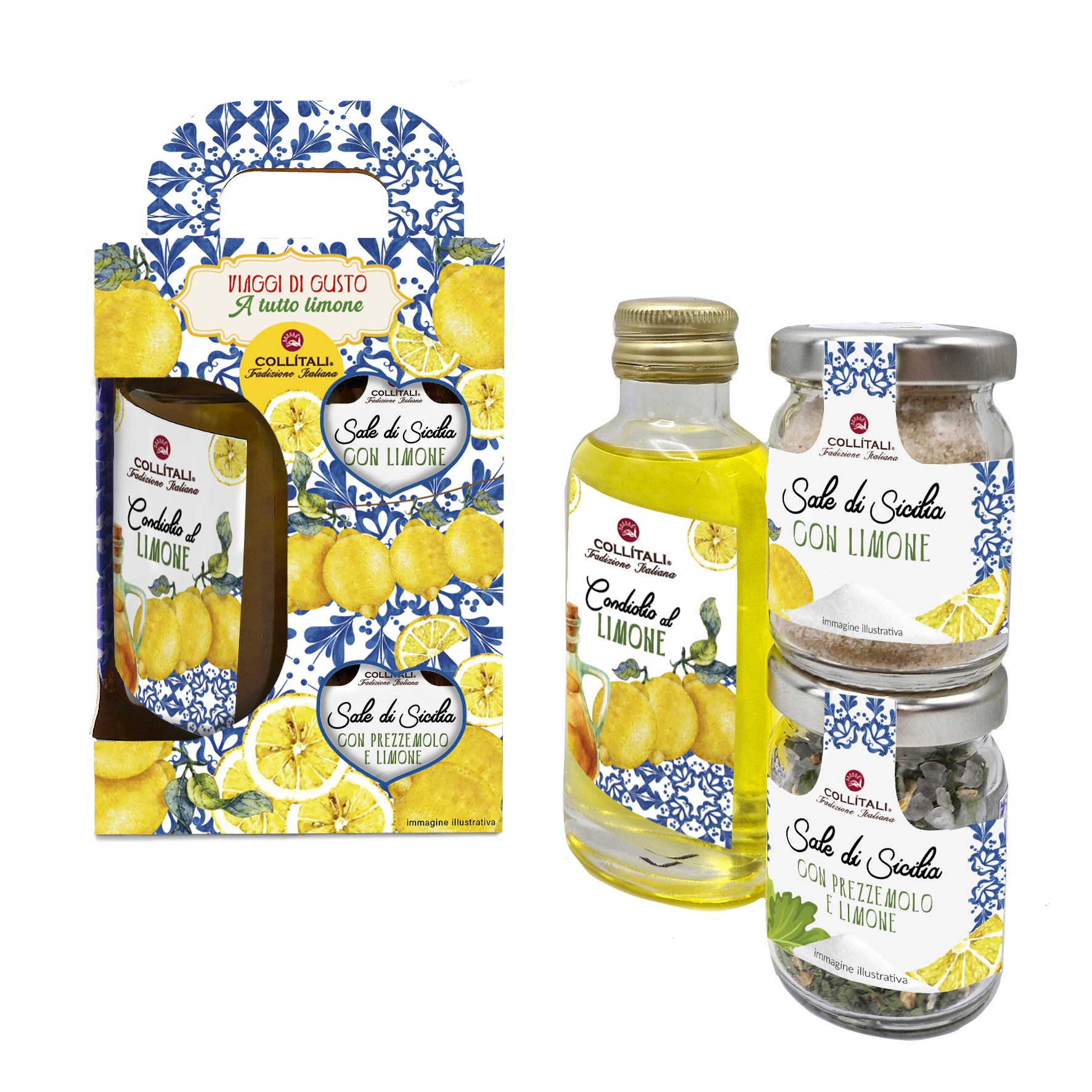 Set con olio al limone, sale di Sicilia con limone, sale di Sicilia con prezzemolo e limone