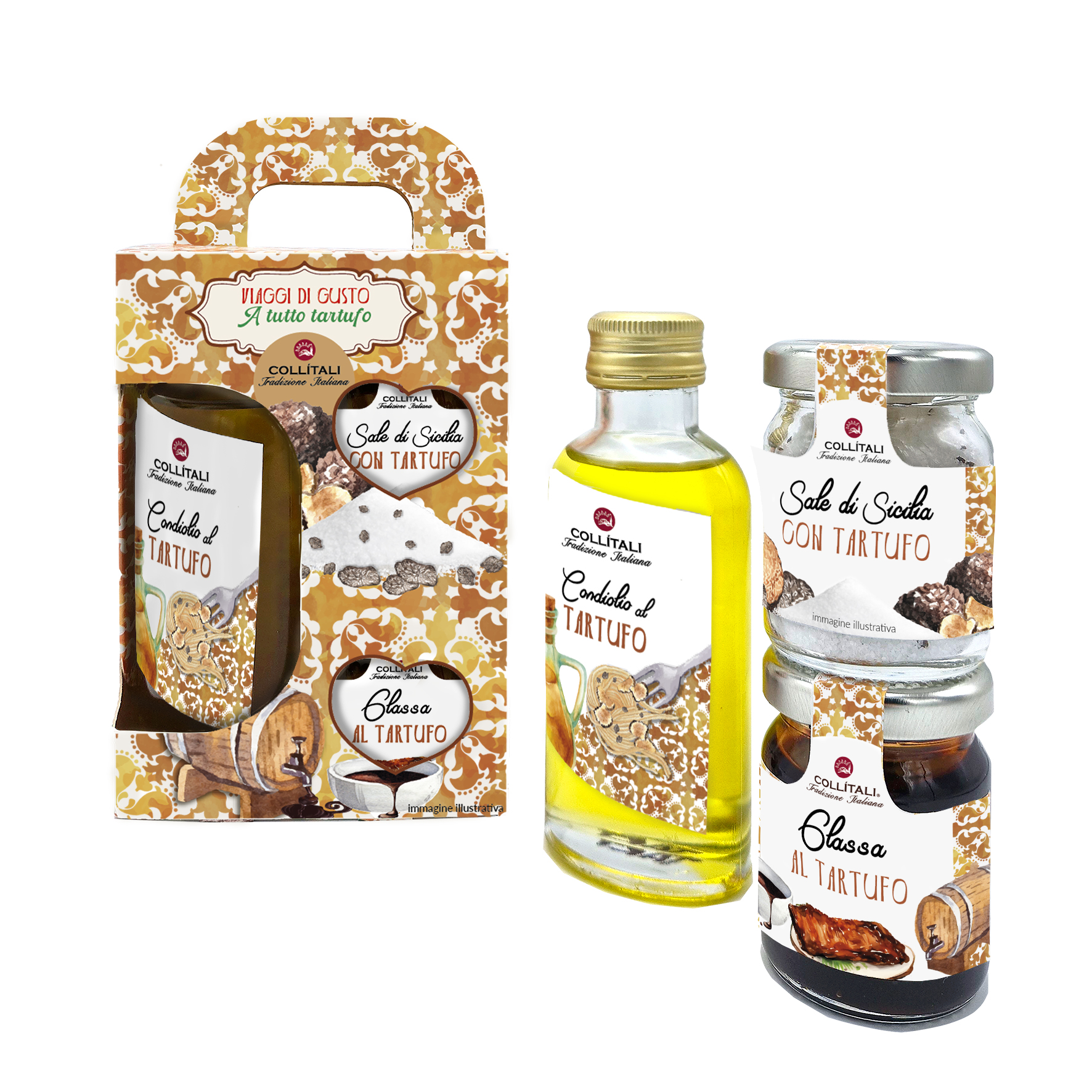 Set con olio al tartufo, sale di Sicilia con tartufo, glassa al tartufo
