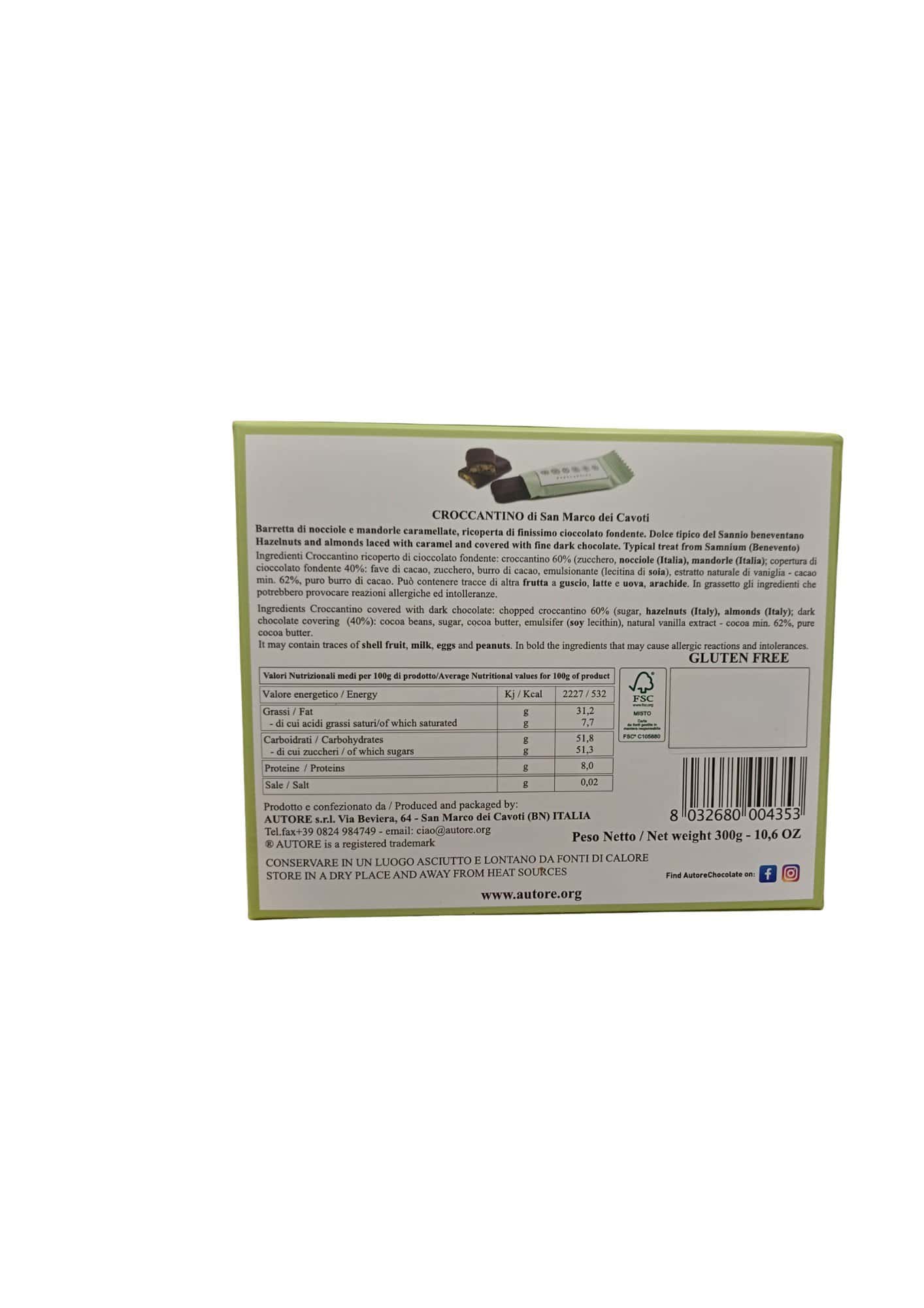 Ingredienti Croccantino ricoperto di cioccolato fondente: croccante 60% (zucchero, NOCCIOLE , MANDORLE ); copertura di cioccolato fondente 40%. Ingredienti per la copertura di Cioccolato Fondente: fave di cacao, zucchero, burro di cacao, cacao (Min 62%), emulsionante (lecitina di SOIA), estratto naturale di vaniglia.