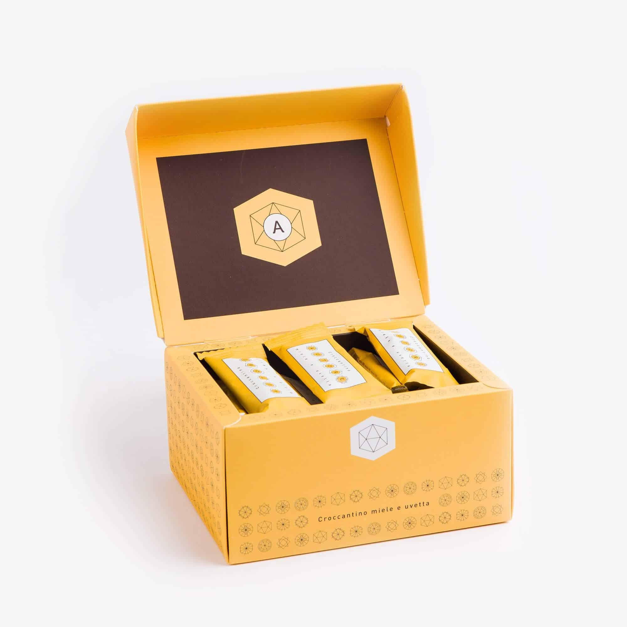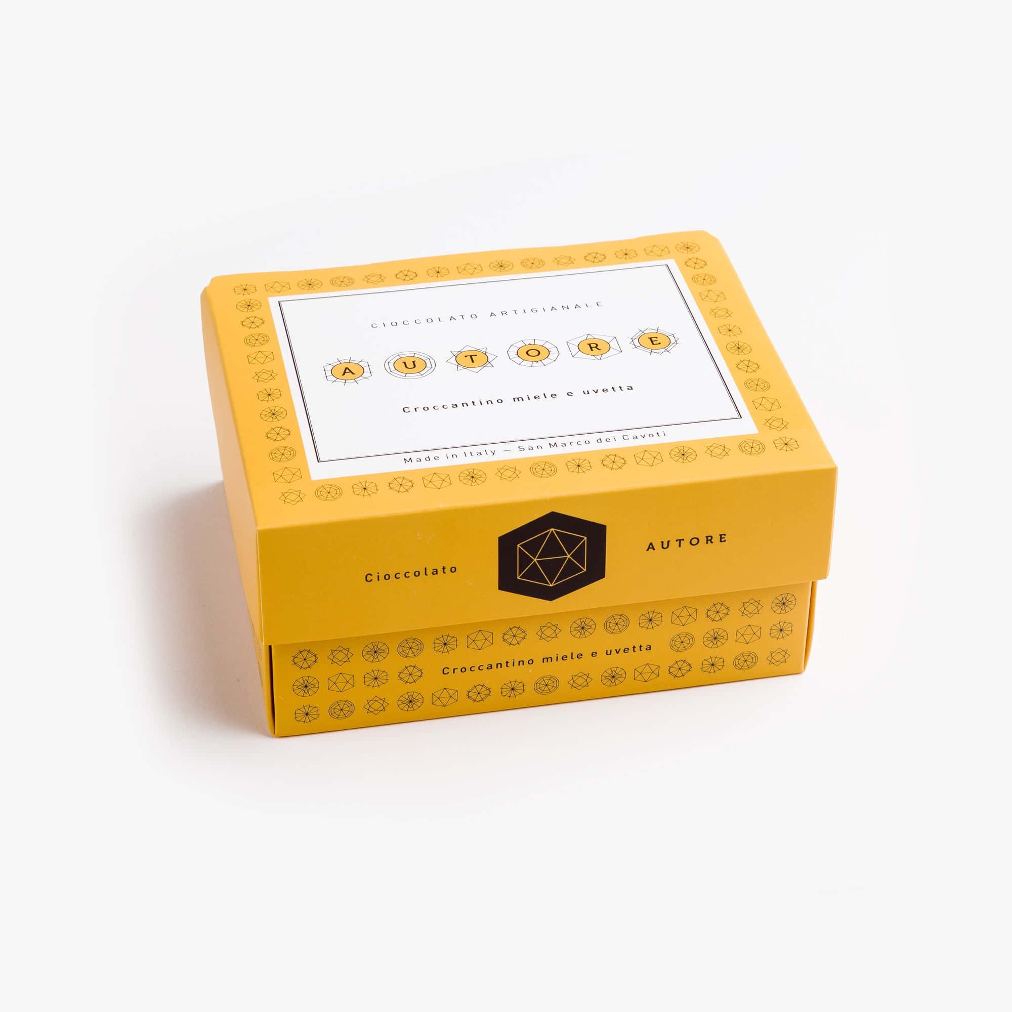 Un originale e colorato astuccio, con apertura a scrigno, che racchiude i Croccantini Miele e Uvetta. Si tratta di barrette formate da nocciole, mandorle, miele ed uvetta, legate da caramello e ricoperte di finissimo cioccolato fondente. Una variazione del Croccantino tradizionale a cui abbiniamo miele di Sulla, proveniente dalle colline del beneventano, ed uva sultanina.