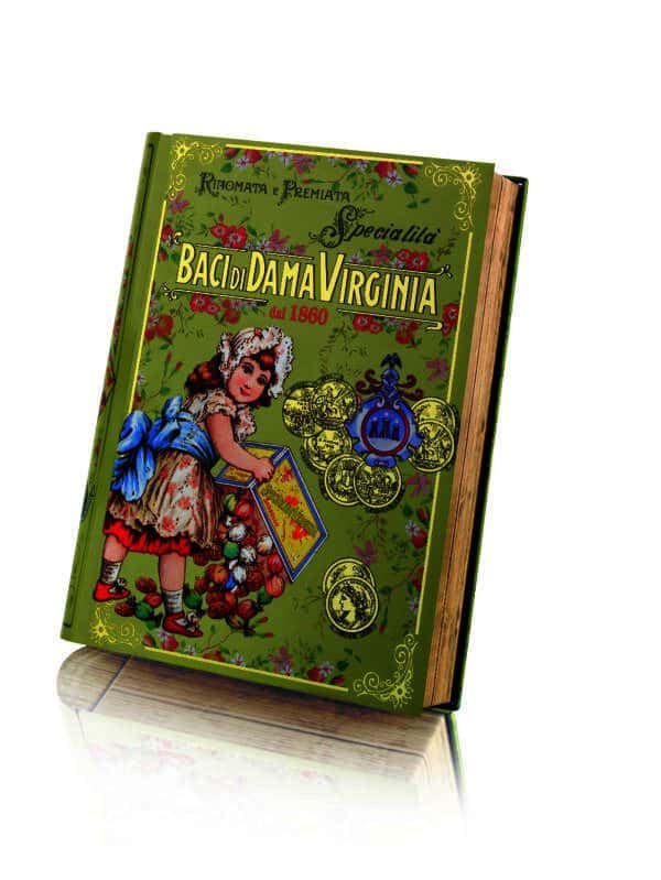 Originale cofanetto in metallo a forma di libro con la grafica istituzione di Amaretti Virginia con all’interno baci di dama