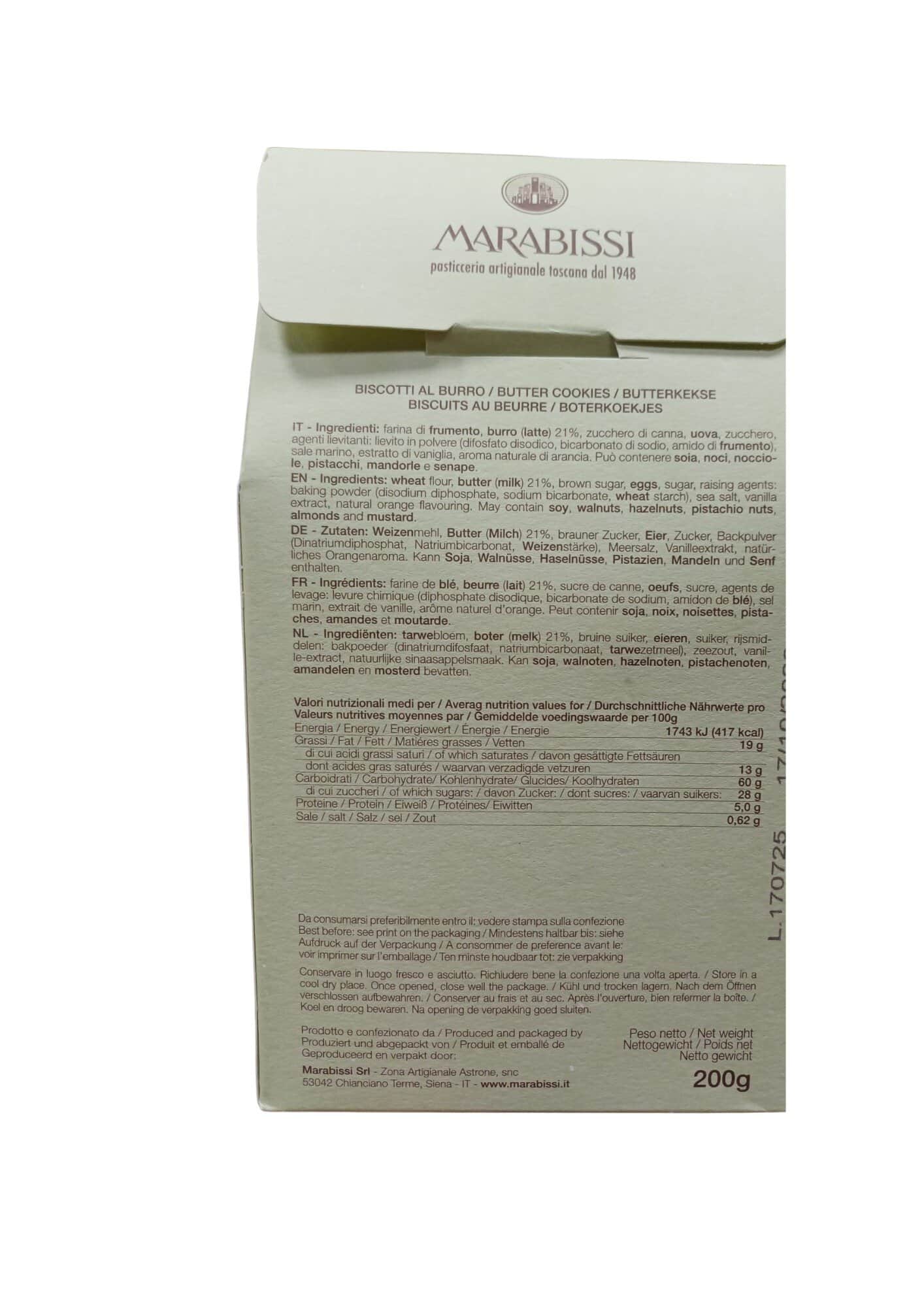 Farina di frumento, burro 22% (latte), zucchero, zucchero di canna, uova, agente lievitante (difosfato disodico, bicarbonato di sodio, amido di frumento), sale marino, olio essenziale di arancia, vaniglia. Può contenere tracce di mandorle, nocciole, noci, pistacchi e soia.