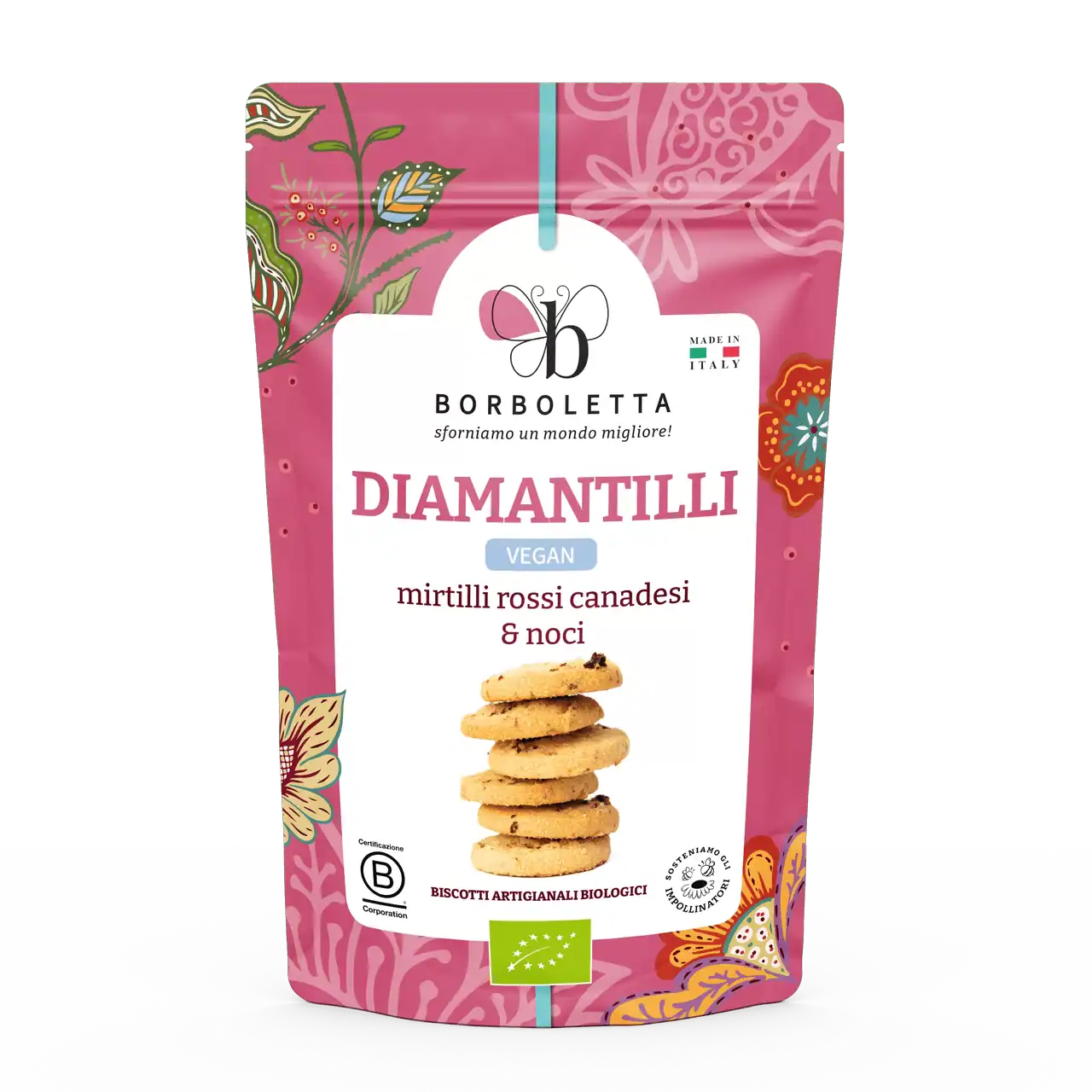 Per chi ama i contrasti, i Diamantilli sono biscotti vegani semplici nella loro composizione, ma complessi nella loro scala aromatica. Nati dall’unione del mirtillo canadese e delle noci.