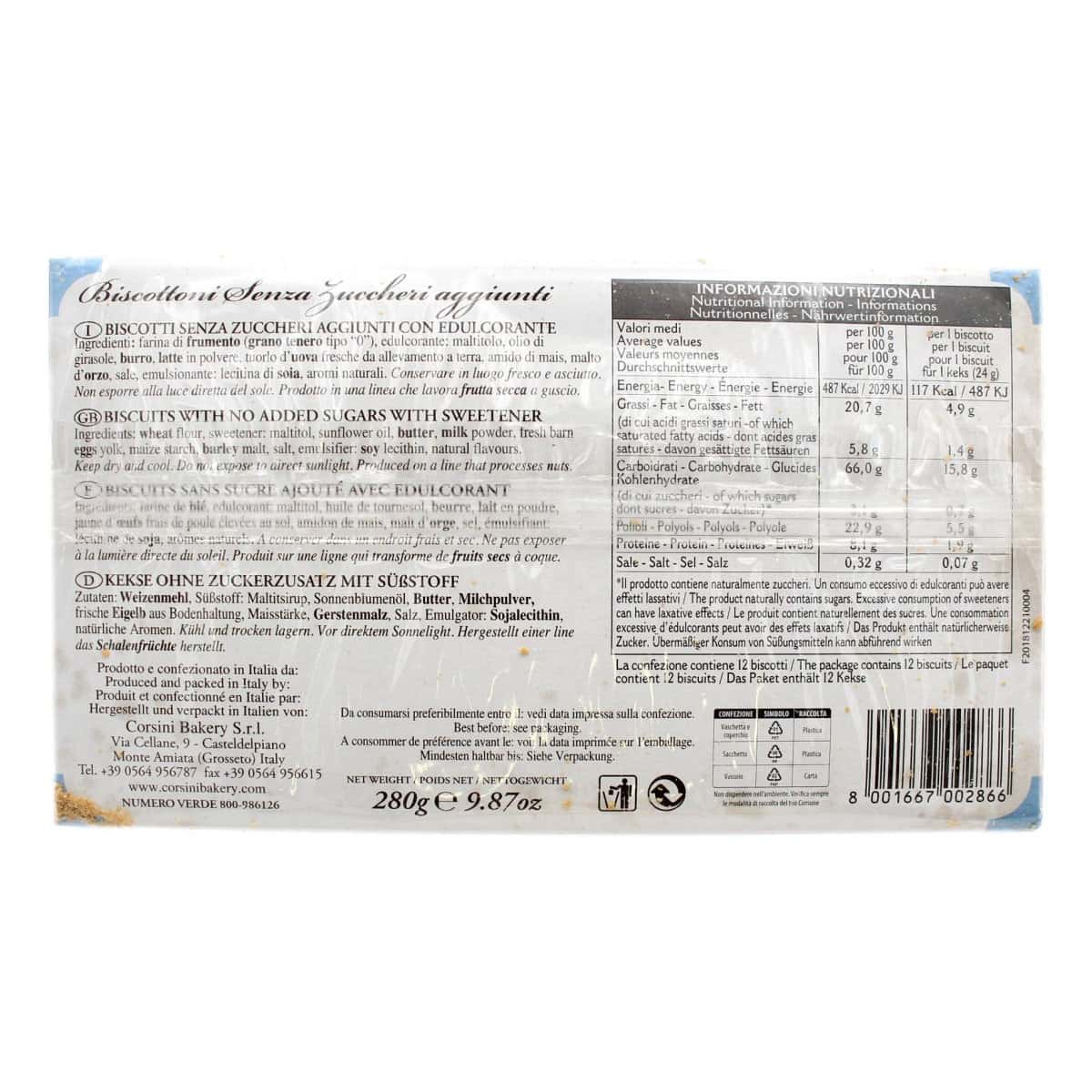 | farina di frumento (grano tenero tipo 0), edulcorante: maltiolo, olio di girasole, burro, latte, tuorlo d’ uova fresche da allevamento a terra, amido di mais, malto d’orzo, sale, emulsionante: lecitina di soia, aromi naturali. |