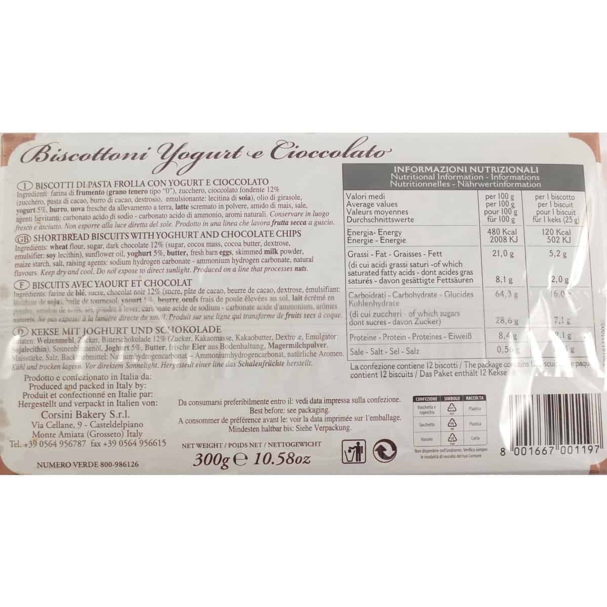 Farina di FRUMENTO (GRANO tenero tipo “0”), zucchero, cioccolato fondente 12%(zucchero, pasta di cacao, burro di cacao, destrosio, emulsionante: lecitina di soia), olio di girasole, YOGURT 5%, BURRO, UOVA, fresche da allevamento a terra, LATTE scremato in polvere, amido di mais, sale, agenti lievitanti:carbonato acido di sodio-carbonato acido di ammonio, aromi naturali.
