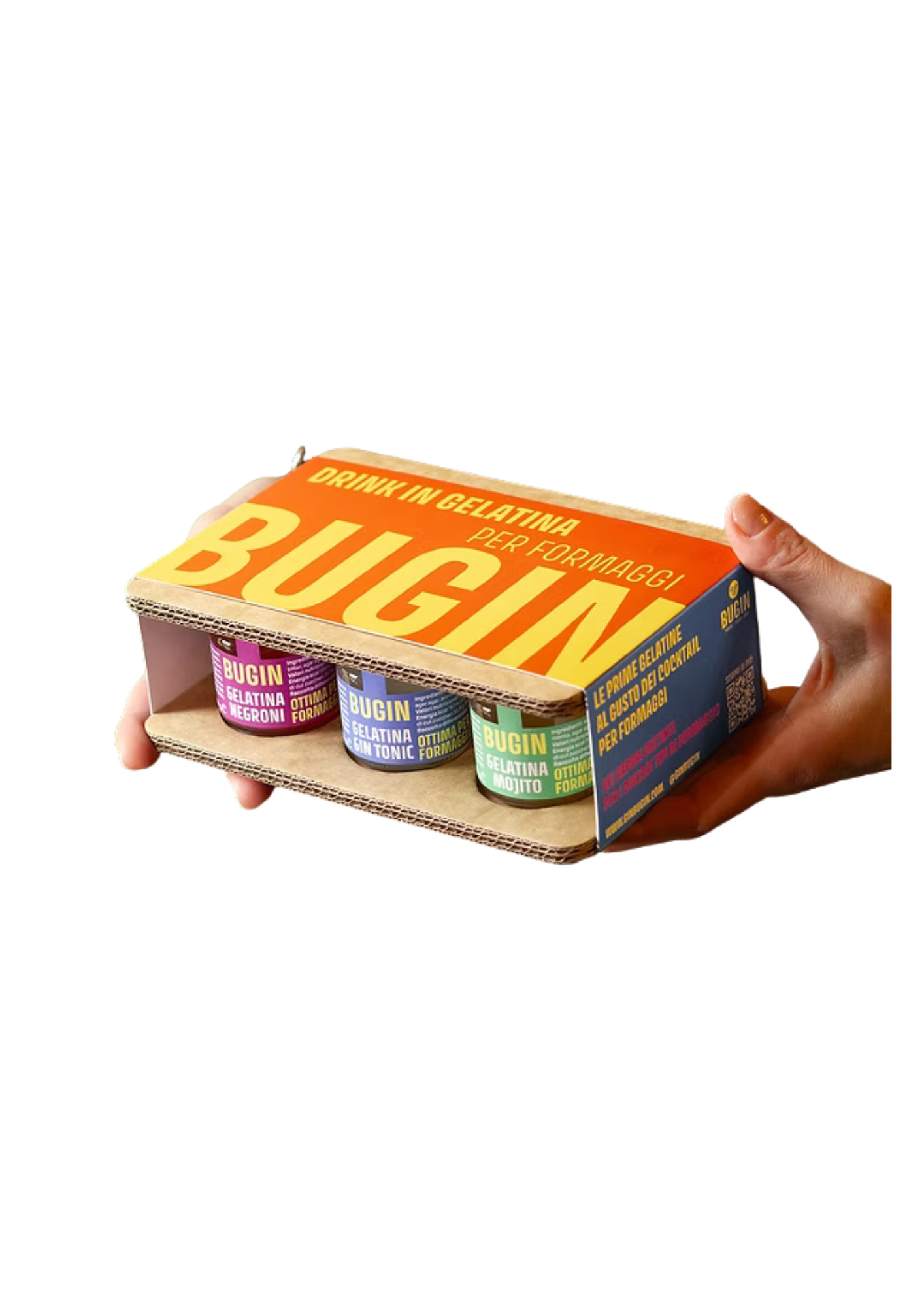 Per un regalo elegante e prelibato, scegli il box con tutti e sei i drink in gelatina: basta sfilare la fascetta per iniziare la degustazione. Le gelatine al gusto dei cocktail sono prodotte da BUGIN nel proprio laboratorio a pochi passi da Torino, con l’obiettivo di esaltare i formaggi in modo davvero inedito.