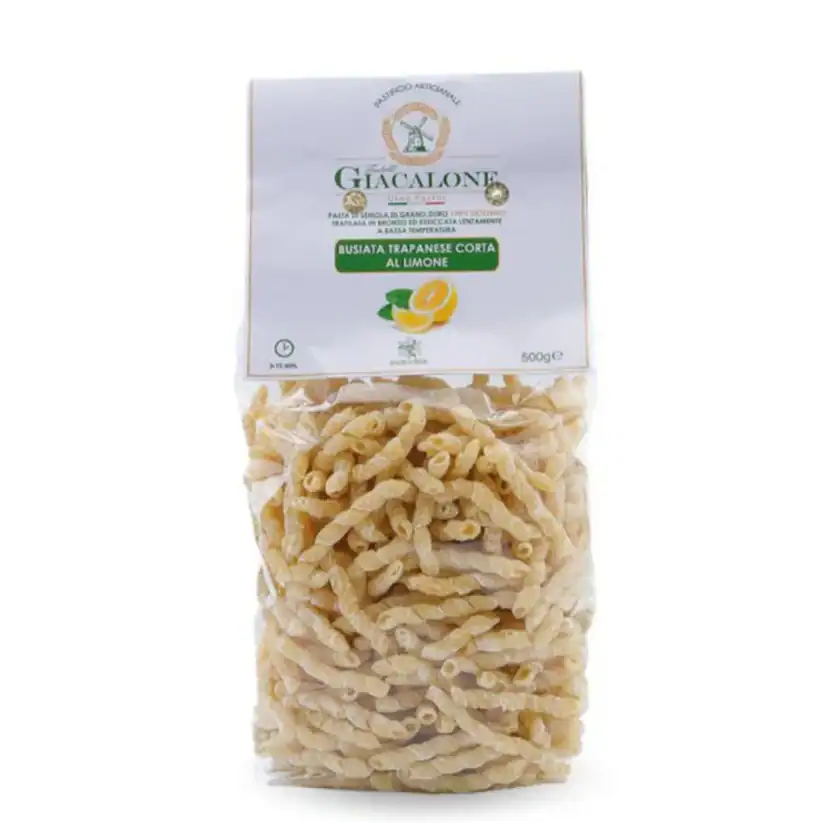 Busiata Trapanese corta al Limone di Semola di Grano Duro Siciliano 500g dei Fratelli Giacalone: pasta artigianale trafilata al bronzo, realizzata con semola di grano duro siciliano di alta qualità. Grazie alla sua superficie ruvida, trattiene perfettamente i condimenti, garantendo un’esperienza culinaria autentica e ricca di sapore. Perfetta per piatti tradizionali e ricette creative.