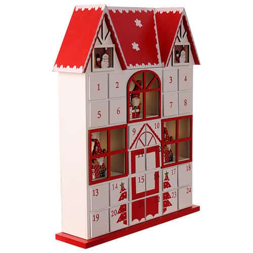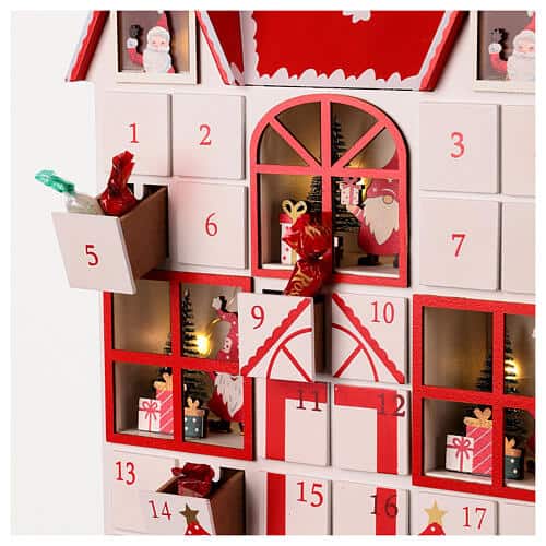 Calendario dell’Avvento divertente e festivo, in legno Il calendario ha forma di una casa, con finestre illuminate che danno scene natalizie con Babbo Natale, regali e alberelli.