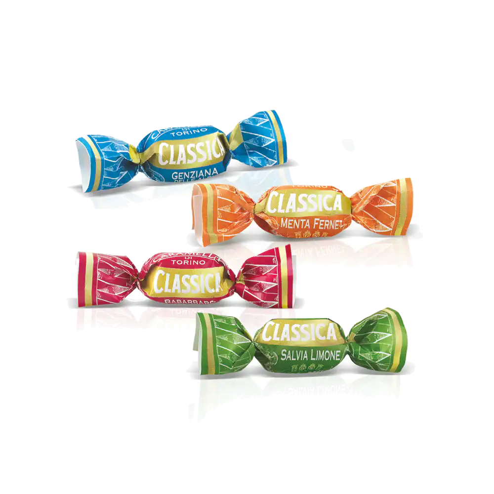 All’interno della confezione, un mix di Caramelle Classica al gusto Rabarbaro, Genziana delle Alpi, Salvia Limone e Menta Fernet.