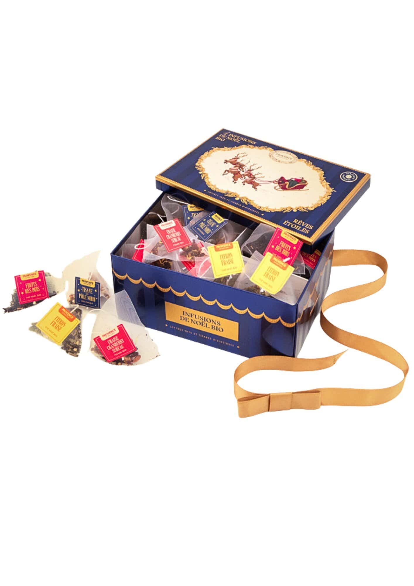 Una delicata confezione regalo con profumi di frutta, spezie ed erbe luminose. Quattro infusi biologici* per accompagnare le serate invernali, dove la calma celeste incontra la fantasia botanica.