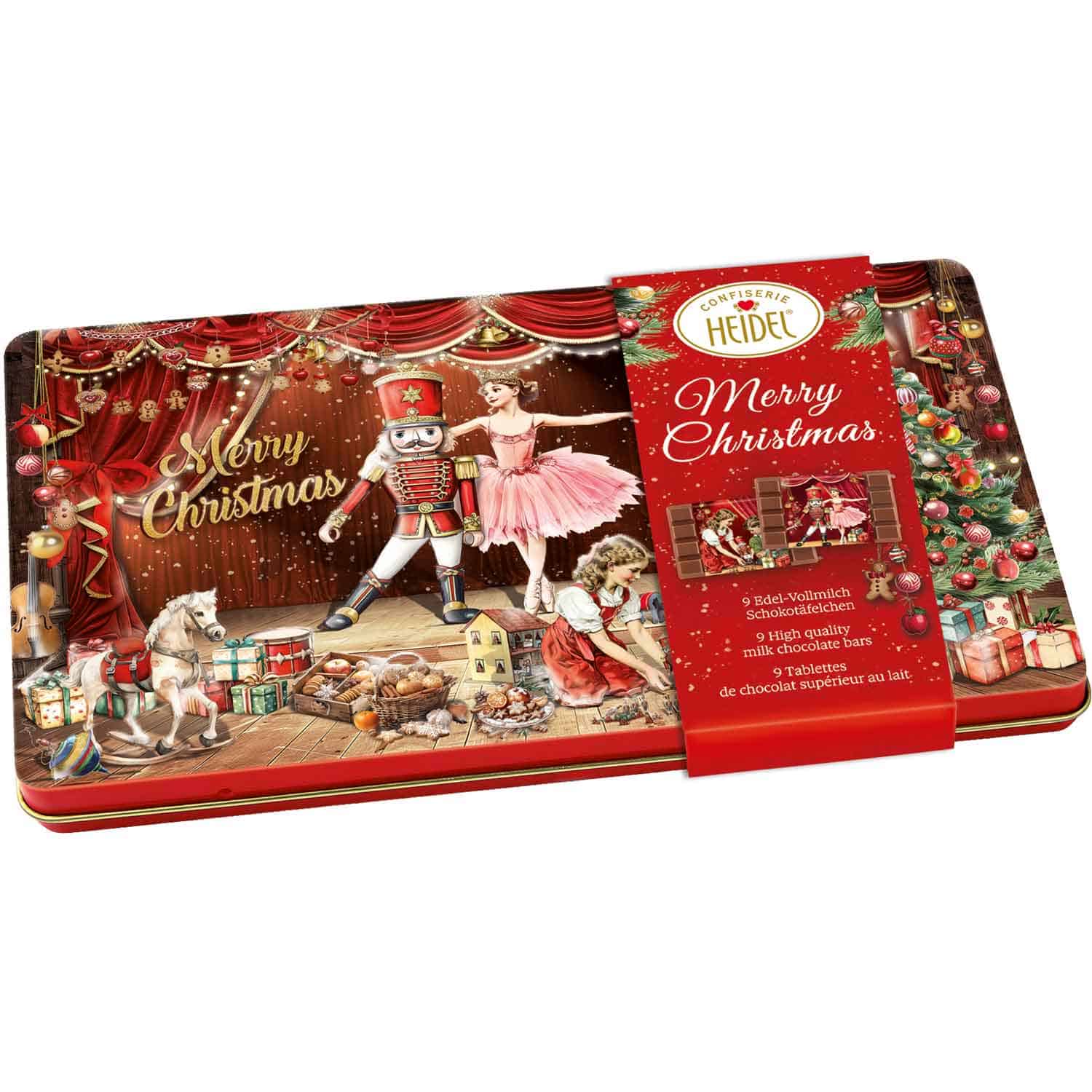Un regalo da favola con un tocco nostalgico: il portagioie Heidel Christmas Fairytale presenta un motivo amorevolmente disegnato del Principe Schiaccianoci, con Clara, un albero di Natale decorato e una scena dettagliata della famosa storia di Natale. All’interno sono presenti nove quadratini di cioccolato al latte premium, squisitamente lavorati, che si sciolgono in bocca. La scatola decorativa in metallo non รจ solo deliziosamente riempita, ma รจ anche un vero e proprio colpo d’occhio, perfetta da collezionare o da regalare. Una piccola opera d’arte che unisce il cioccolato pregiato alla fantasia invernale.