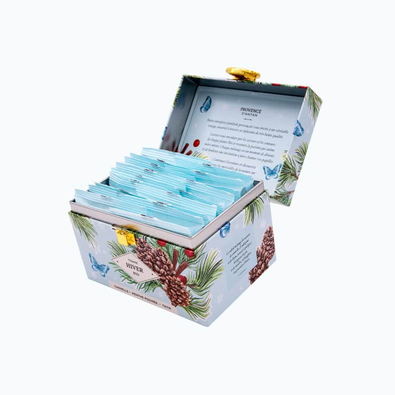 Una tisana sensoriale da assaporare lentamente, in un’elegante scatola metallica da collezione, compagna ideale delle giornate invernali.
