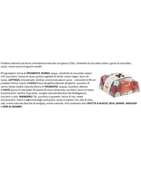 IT Ingredienti della pasta (85%): farina di FRUMENTO, cioccolato 18% (zucchero, pasta di cacao, burro di cacao, emulsionante: lecitine di SOIA, aroma