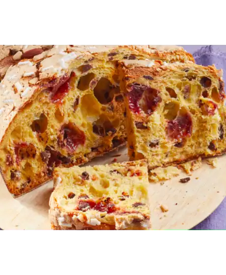 La Colomba Lampone e Cioccolato Filippi unisce il gusto avvolgente del cioccolato fondente e la freschezza del lampone, il tutto ricoperto da una glassa di Mandorle Prima Bari.