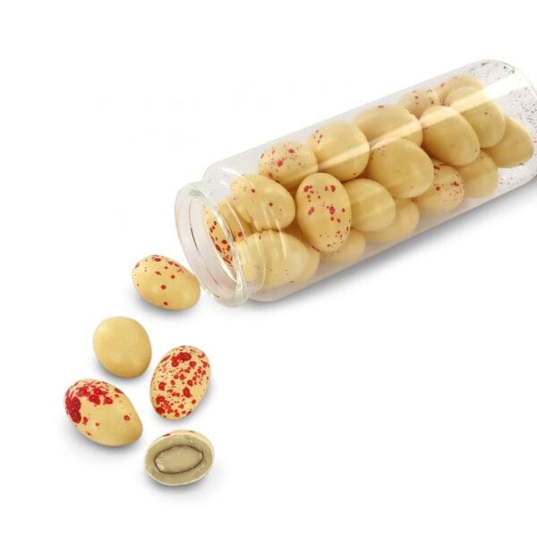 Ingredienti: cioccolato bianco 49% (zucchero, burro di cacao, latte intero in polvere, massa di cacao, emulsionante: lecitina di soia, aroma naturale di vaniglia. Cacao min. 29%), mandorla tostata 21%, zucchero, addensanti: maltodestrina, gomma arabica, amido di riso, agente di rivestimento: cera carnauba, coloranti: E100 (se giallo), E120 (se rosa), E124* (se rosso – *può influire negativamente sull’attività e l’attenzione dei bambini), E133 (se celeste), E160a (se arancione), E171 (se bianco), E120+E133 (se lilla), E100+E133 (se verde), E151 (se beige), aromi. Allergeni: oltre a latte, soia e mandorla, il prodotto può contenere nocciole, noci, noci pecan, pistacchi, anacardi. Senza glutine. 497 kcal/100 g.Condizioni di conservazione: conservare in luogo fresco e asciutto
