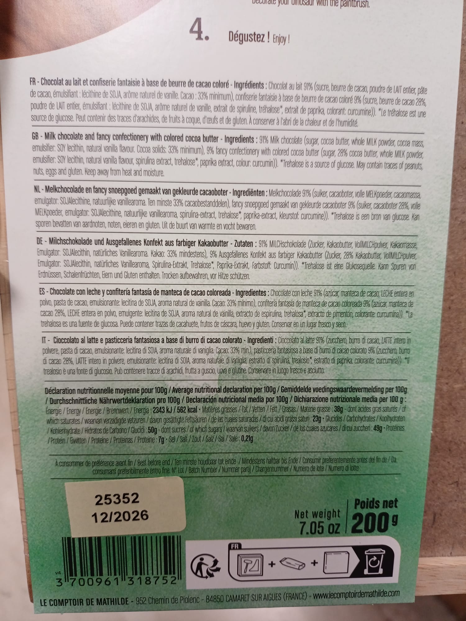 cioccolato al latte 94% (sucre, burro di cacao, poudre de LAIT intero, pasta di cacao, emulsionante: lecitina di SOJA, aroma naturale di vaniglia. Cacao: 33% minimo), confiserie fantasia a base di burro di cacao colorato 6% (sucre, burro di cacao 30%, poudre de LAIT intero, emulsionante: lecitina di SOJA, aroma naturale di vaniglia, estratto di spirulina, trealosio*, estratto di paprika, colorante: curcumina)). *Il trealosio è una fonte di glucosio.