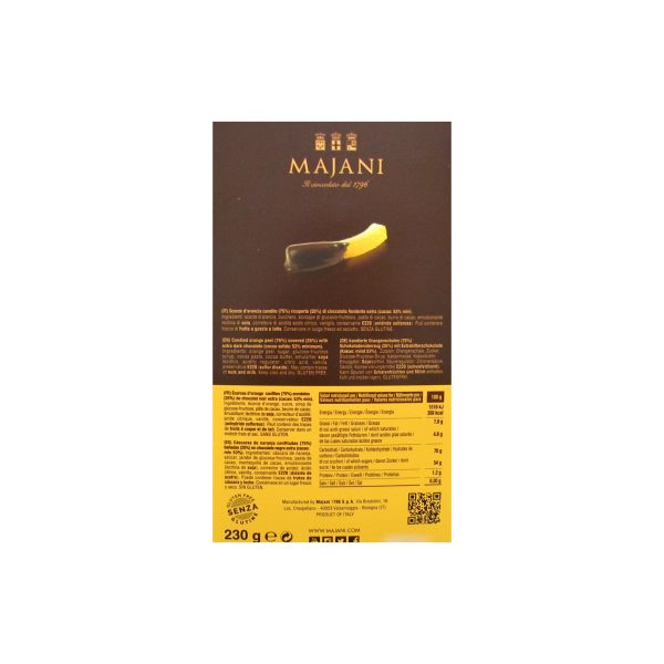 Arancia, zucchero, sciroppo di glucosio – fruttosio, pasta di cacao, burro di cacao, emulsionante lecitina di SOYA, correttore di acidità (acido citrico), vaniglia, conservante E220 (ANIDRIDE SOLFOROSA). Puo’ contenere tracce di NOCCIOLE, MANDORLE, PISTACCHI e LATTE