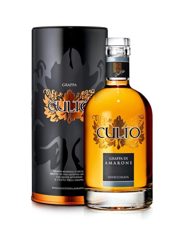 La grappa di Amarone Culto di Rossi D’Asiago è prodotta dalle vinacce di uve passite utilizzate per la produzione del pregiato vino Amarone di Valpolicella e invecchiata in barrique di legno pregiato per oltre 12 mesi. E’ una grappa morbida, calda ed equilibrata, dal colore giallo dorato e dal profumo intenso con gradevoli sensazioni di uve passite che conferiscono una particolare morbidezza e lievi sfumature di legno. Al palato risulta morbida, calda ed equilibrata, con iniziali note di uva passa che evolvono in sensazioni di fiori secchi e mallo di noci.