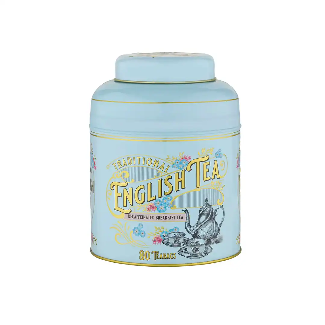Un tocco retrò che conquista al primo sguardo: la latta Vintage Victorian in verde menta è un omaggio all’eleganza dell’epoca vittoriana. Il design, impreziosito da illustrazioni di teiere e tazze d’epoca, decorazioni dorate e fiori Forget-Me-Not, custodisce 80 bustine di English Breakfast deteinato. Un tè nero corposo e aromatico, il preferito dagli inglesi, perfetto con un goccio di latte in qualsiasi momento della giornata. Un’idea regalo raffinata o un pezzo da collezione per veri amanti del tè. Misure: diam. 11,5 – alt. 16,5 cm