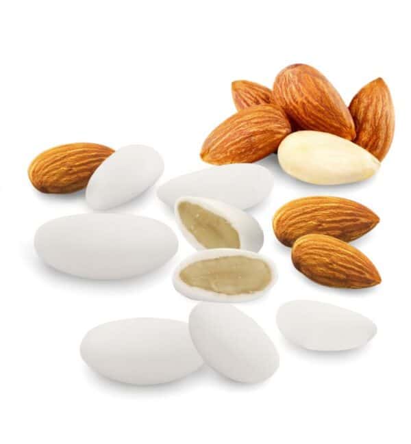 Ingredienti: mandorla di Avola 45%, zucchero, addensanti: amido di riso, maltodestrina, coloranti: E100 (se giallo), E120 (se rosa), E124* (se rosso – *può influire negativamente sull’attività e l’attenzione dei bambini), E133 (se celeste), E160a (se arancione), E171 (se bianco), E174 (se argento), E120+E133 (se lilla), E100+E133 (se verde), aroma: vanillina, agente di rivestimento: cera carnauba. Allergeni: oltre a mandorle, il prodotto può contenere nocciole, noci, noci pecan, pistacchi, anacardi, soia, latte. Senza glutine. 484 kcal/100 g.Condizioni di conservazione: conservare in luogo fresco e asciutto