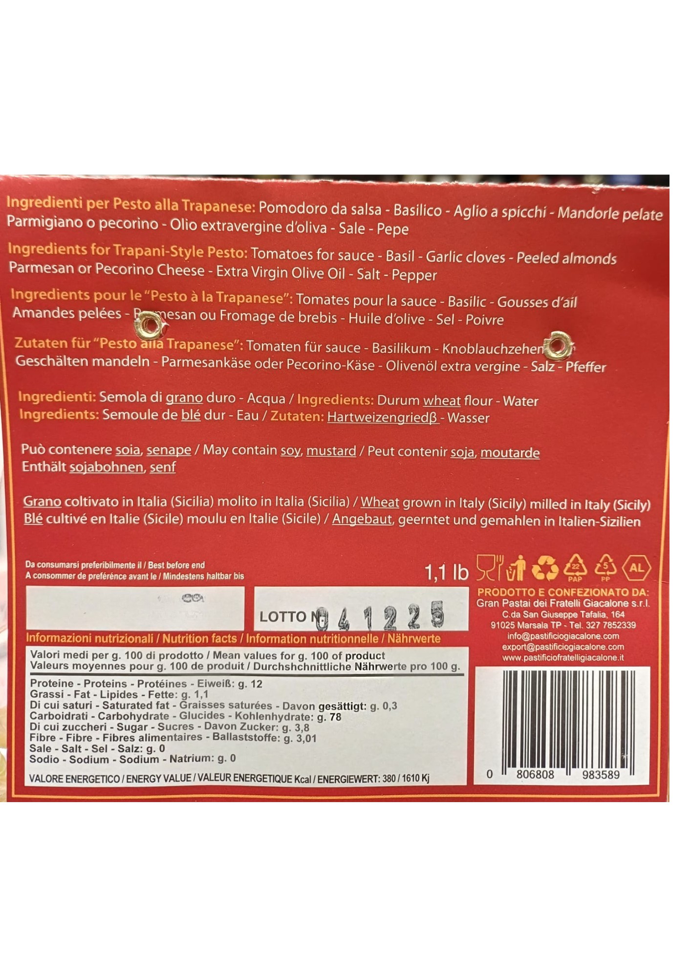 Il vero segreto della pasta dei Fratelli Giacalone risiede nella materia prima di base, ovvero la semola di grano duro siciliano trafilata in bronzo ed essiccata lentamente (20/30 ore d’essiccazione) a bassa temperatura (a 35/43 gradi centigradi): è così che nasce la Busiata Trapanese.