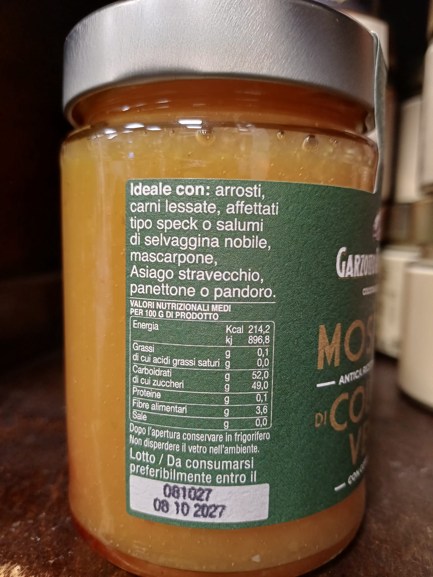 INGREDIENTI: Mele Cotogne (origine Veneto),sciroppo di glucosio e fruttosio, Frutta Candita in proporzione variabile(cubetti di arancia candita, albicocche, pere, fichi, clementine, ciliegie)