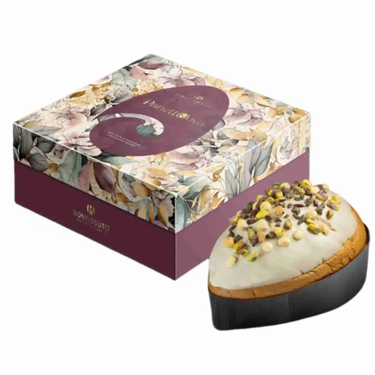 Dolce da forno tradizionale a lievitazione naturale con copertura di cioccolato bianco e pistacchi interi.