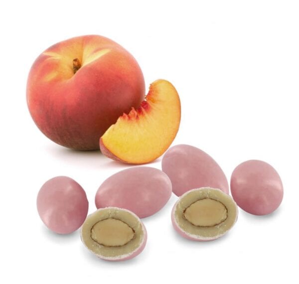 La confettatura di colore rosa di questi confetti racchiude un gustoso strato di cioccolato bianco aromatizzato alla pesca, che avvolge una mandorla tostata. La sinfonia dei vari sapori, favorita dal giusto bilanciamento tra la dolcezza del cioccolato, l’intensità del gusto della pesca e la nota piacevolmente amarognola della mandorla, rende ogni confetto semplicemente irresistibile