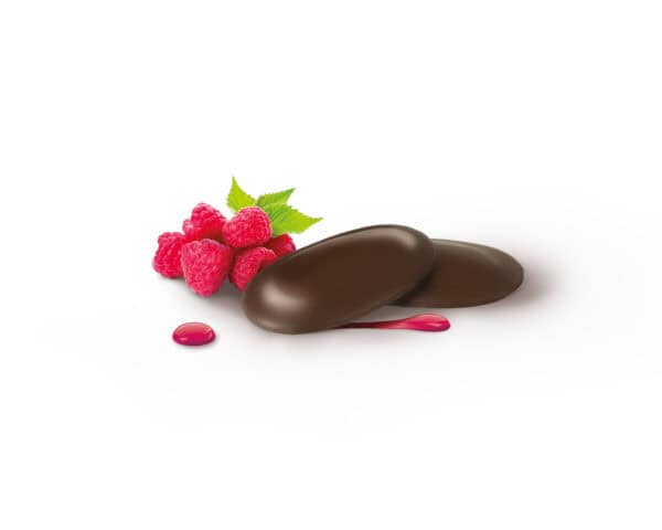 Ripieno: zucchero, glucosio, purè di lampone (50%), burro, emulsionante: lecitina di soia, burro di cacao.