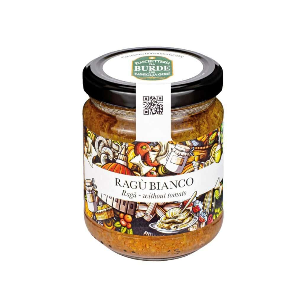 Cipolle, carne di manzo 20%, carote, carne di suino 13%, olio extra vergine di oliva, vino rosso, sedano, sale, scorza di limone. Contiene solfiti.