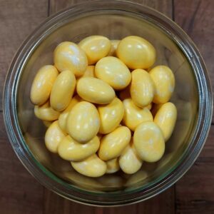 Ingredienti: cioccolato bianco 49% (zucchero, burro di cacao, latte intero in polvere, massa di cacao, emulsionante: lecitina di soia, aroma naturale di vaniglia. Cacao min. 29%), mandorla tostata 21%, zucchero, addensanti: maltodestrina, gomma arabica, amido di riso, agente di rivestimento: cera carnauba, coloranti: E100 (se giallo), E120 (se rosa), E124* (se rosso – *può influire negativamente sull’attività e l’attenzione dei bambini), E133 (se celeste), E160a (se arancione), E171 (se bianco), E120+E133 (se lilla), E100+E133 (se verde), E151 (se beige), aromi. Allergeni: oltre a latte, soia e mandorla, il prodotto può contenere nocciole, noci, noci pecan, pistacchi, anacardi. Senza glutine. 497 kcal/100 g. Condizioni di conservazione: conservare in luogo fresco e asciutto