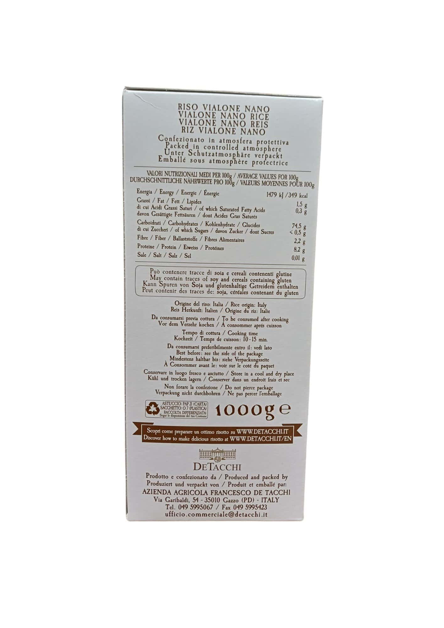Riso semifino vialone nano de tacchi, presidio slow food, coltivato e confezionato nel’area anticamente amministrata dalle monache benedettine di grumolo delle abbadesse, origine materia prima: italia.