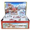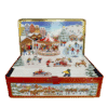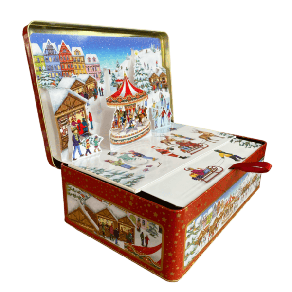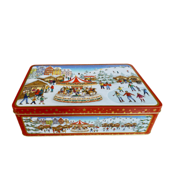 mercatino di Natale con giostra e pista di ghiaccio. Il coperchio della lattina è in rilievo.