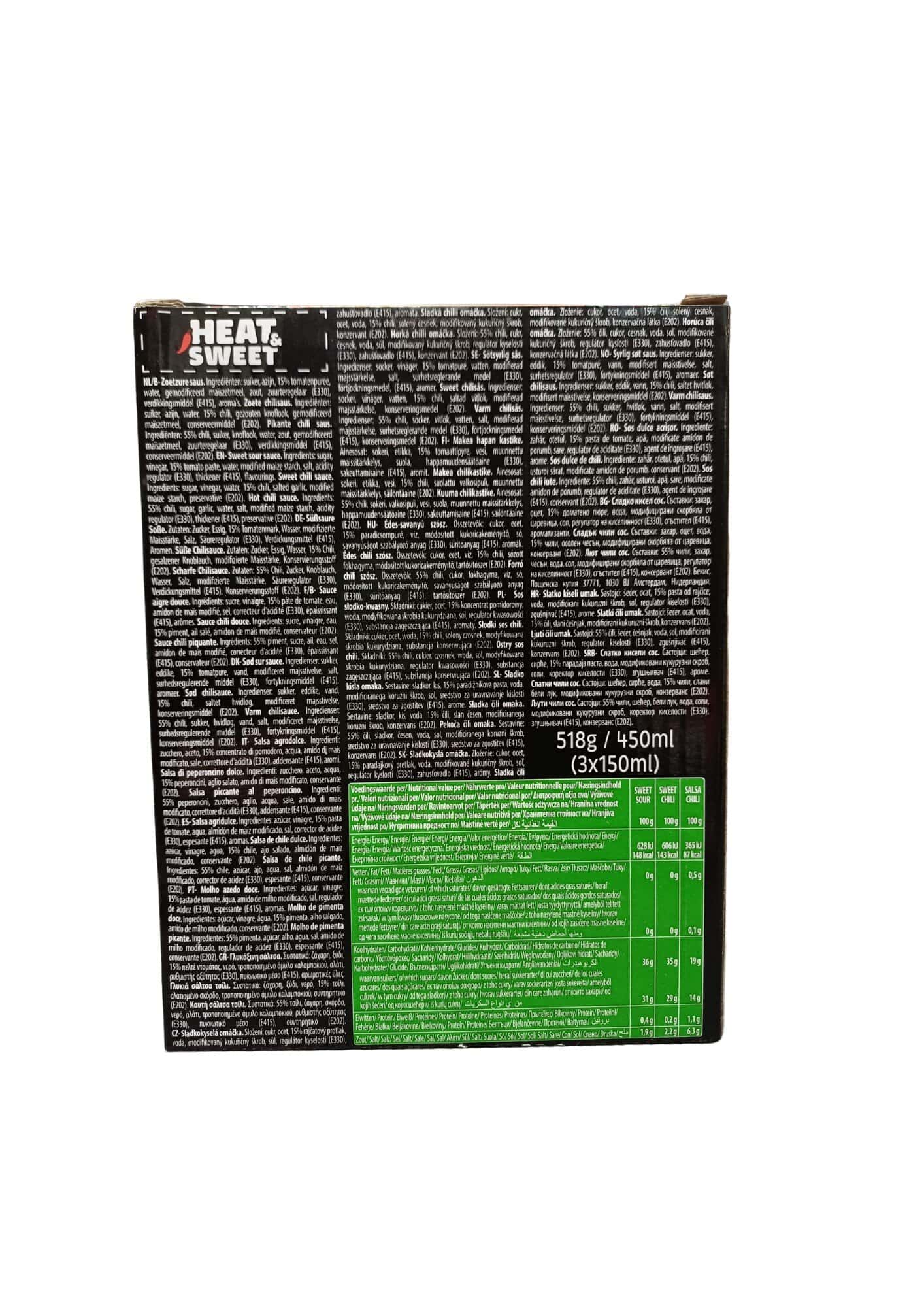 Salsa piccante al pepe chipotle. Ingredienti: acqua, 34% pepe chipotle, zucchero, sale, spezie (aglio, cipolla), correttore di acidità (E260), colorante (E150d), addensante (E415), sapore affumicato. Salsa piccante di peperoni rossi. Ingredienti: acqua, 27% pepe rosso, peperoncino di Cayenna, sale, correttore di acidità (E260), addensante (E415). Salsa di mango piccante. Ingredienti: acqua, zucchero, 19% polpa di mango, 9% polpa di frutto della passione, correttore di acidità (E260), sale, pepe di Cayenna, addensante (E415), pepe Habanero, conservante (E211), colorante (E100).