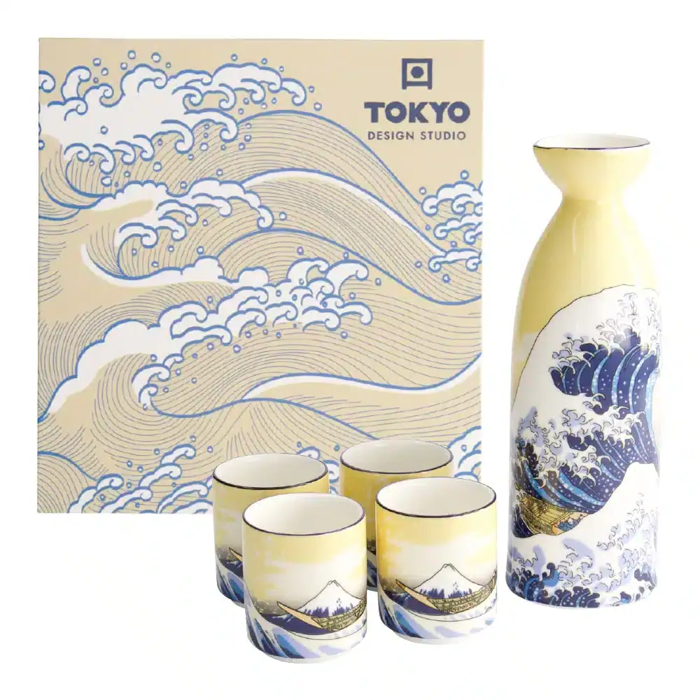 Assaporate il gusto raffinato del sake giapponese con questo set da sake di Tokyo Design Studio Kawaii Hokusai. Il set include un’elegante bottiglia da 120 ml e quattro tazze da 50 ml abbinate, decorate con l’iconico motivo a onde di Hokusai. Perfetto per occasioni speciali o come regalo unico.