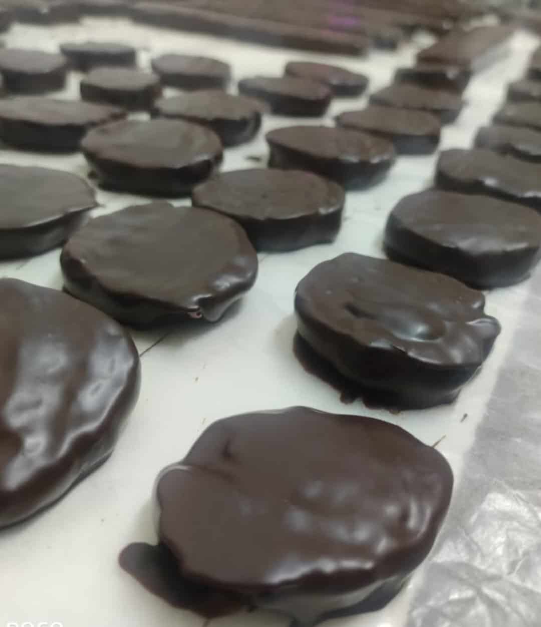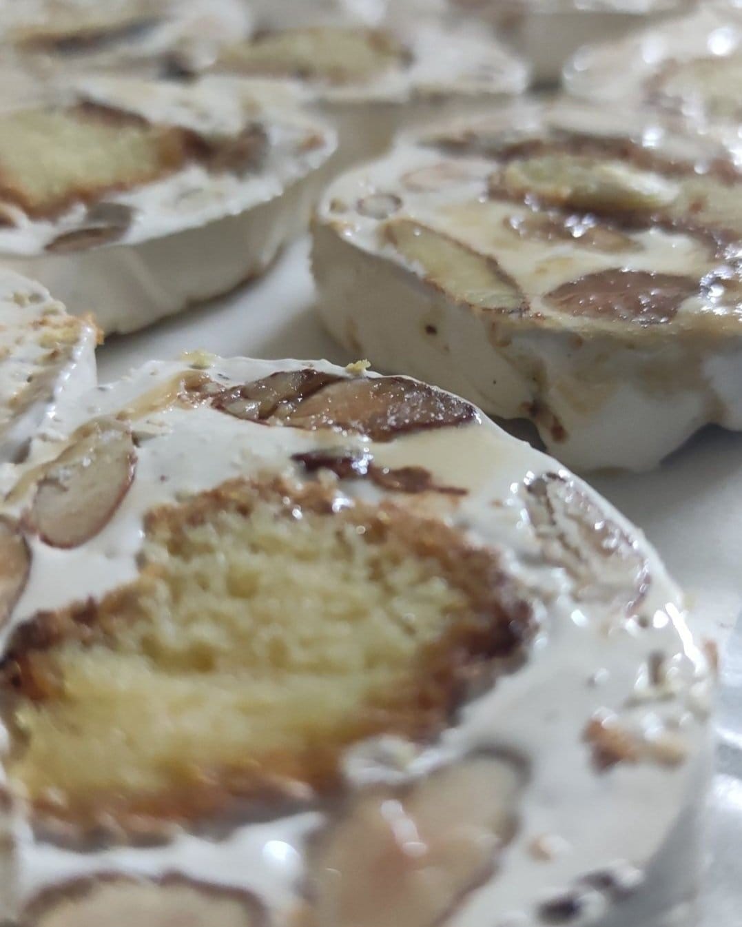 La base del torrone è formata da un cuore friabile di Pan di Spagna bagnato con liquore, leggero e soffice, che viene abilmente amalgamato con ingredienti selezionati come miele, zucchero e mandorle tostate. Questa struttura interna, grazie alla sua friabilità, crea un contrasto piacevole con la copertura di cioccolato fondente, che avvolge completamente il torrone. Il cioccolato di alta qualità conferisce una nota intensa e vellutata, bilanciando perfettamente la dolcezza del Pan di Spagna e del torrone stesso.