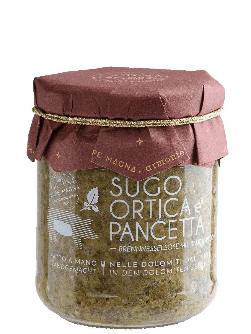 Il tono aspro dei germogli dell’ortica dal colore verde spiccato si abbina alla dolcezza della pancetta affumicata a pezzettoni in una besciamella salata per creare un connubio di sapore fresco e aromatico.