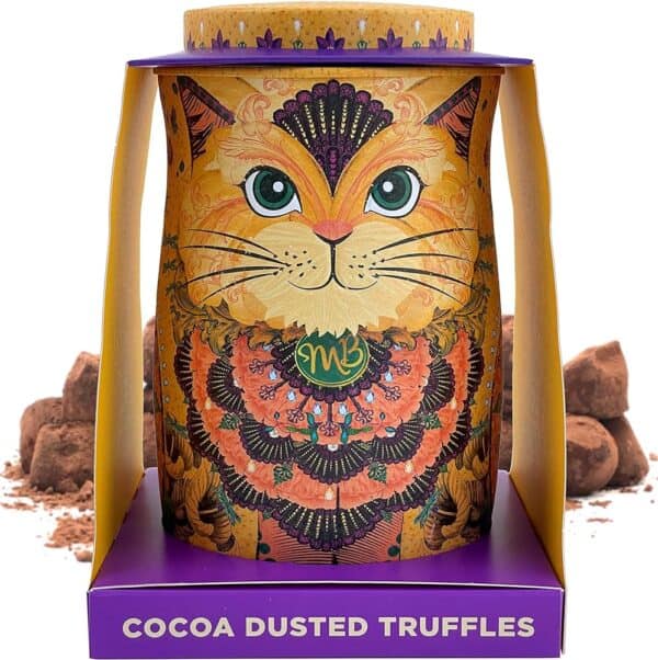 La divina e pluripremiata ricetta di tartufo spolverato di cacao, infuso con scaglie cremose di caramello al burro e un tocco sfacciato di sale marino, delizierà sicuramente qualsiasi amante del cioccolato, confezionato in una scatola di latta per gatti da collezione di alta qualità.