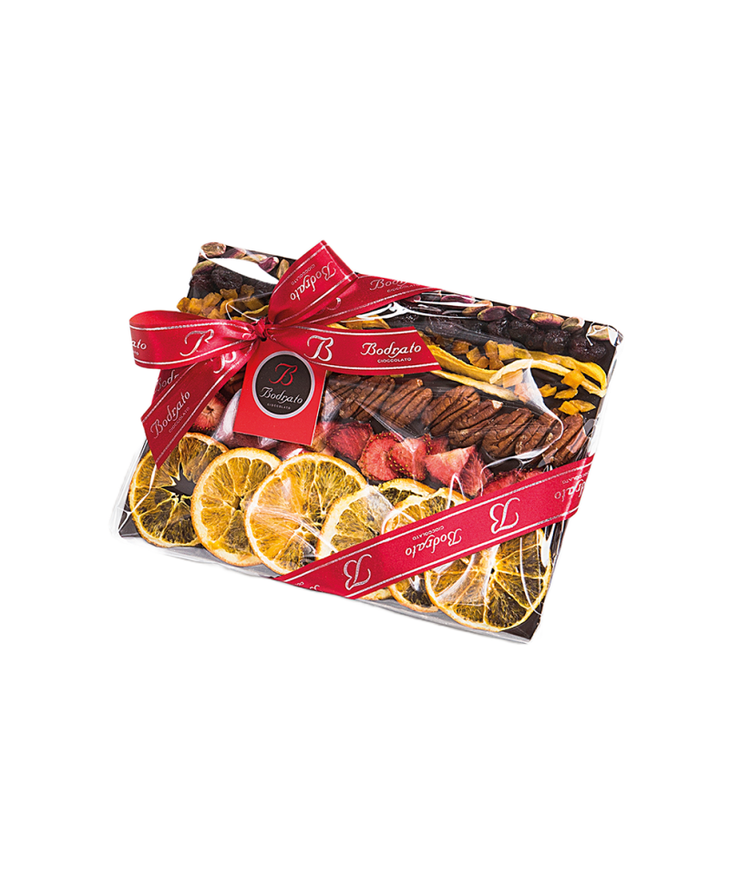 Tavoletta gustosa di cioccolato al latte con frutta assortita tra cui arancia, mirtillo rosso, pistacchio, noci pecan, uva sultanina e fragola.