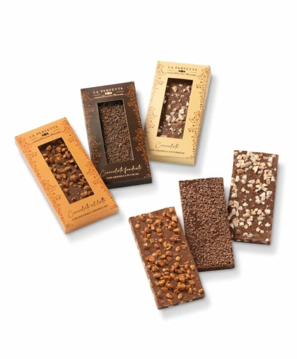 La Perfetta al Cioccolato al latte con nocciole caramellate, la Perfetta al Cioccolato con granella di torrone ed infine, la Perfetta al cioccolato fondente con granella di cacao. Sono state tutte incorniciate con un raffinato astuccio in nuance. Non sai quale gusto scegliere?